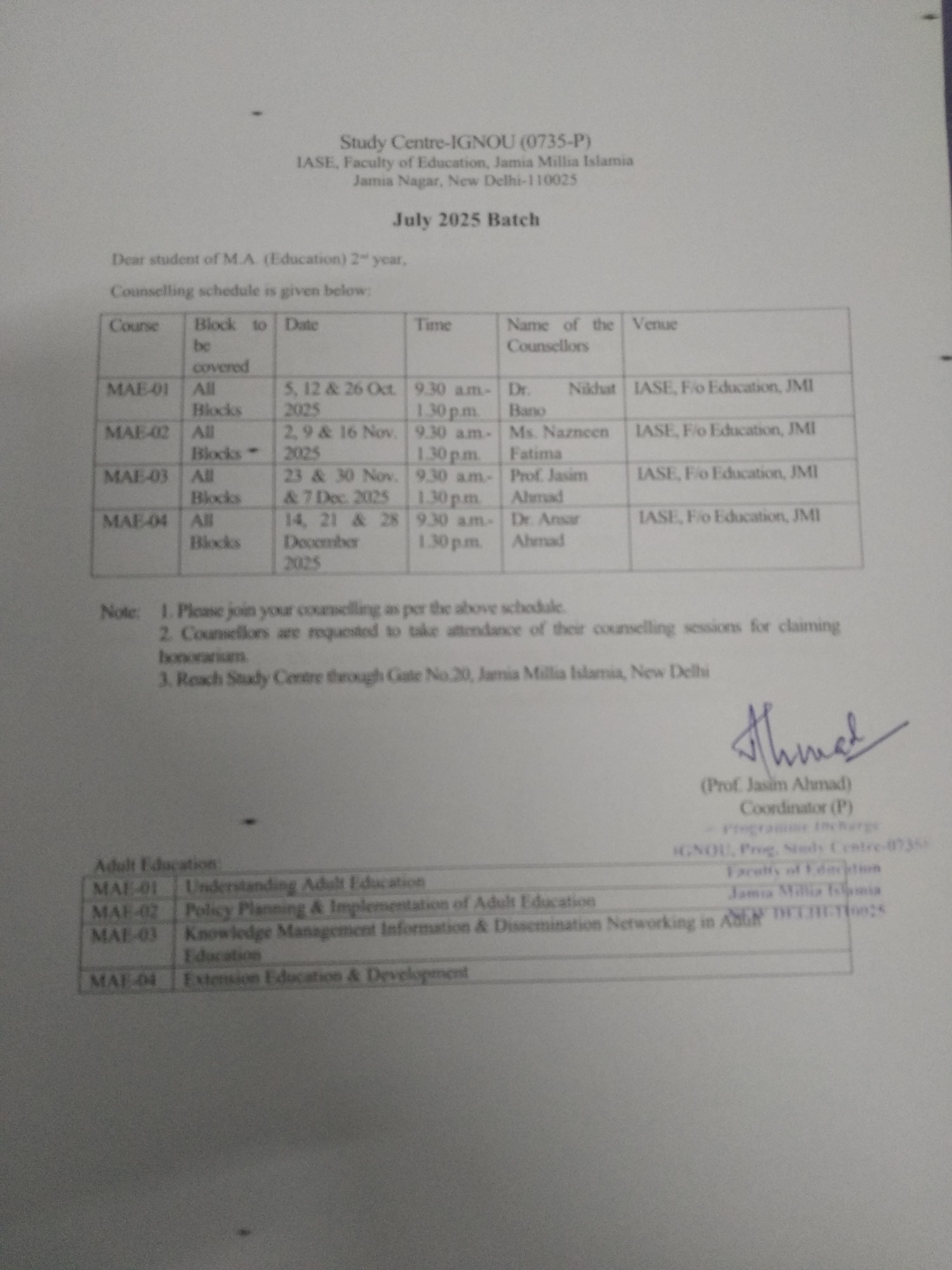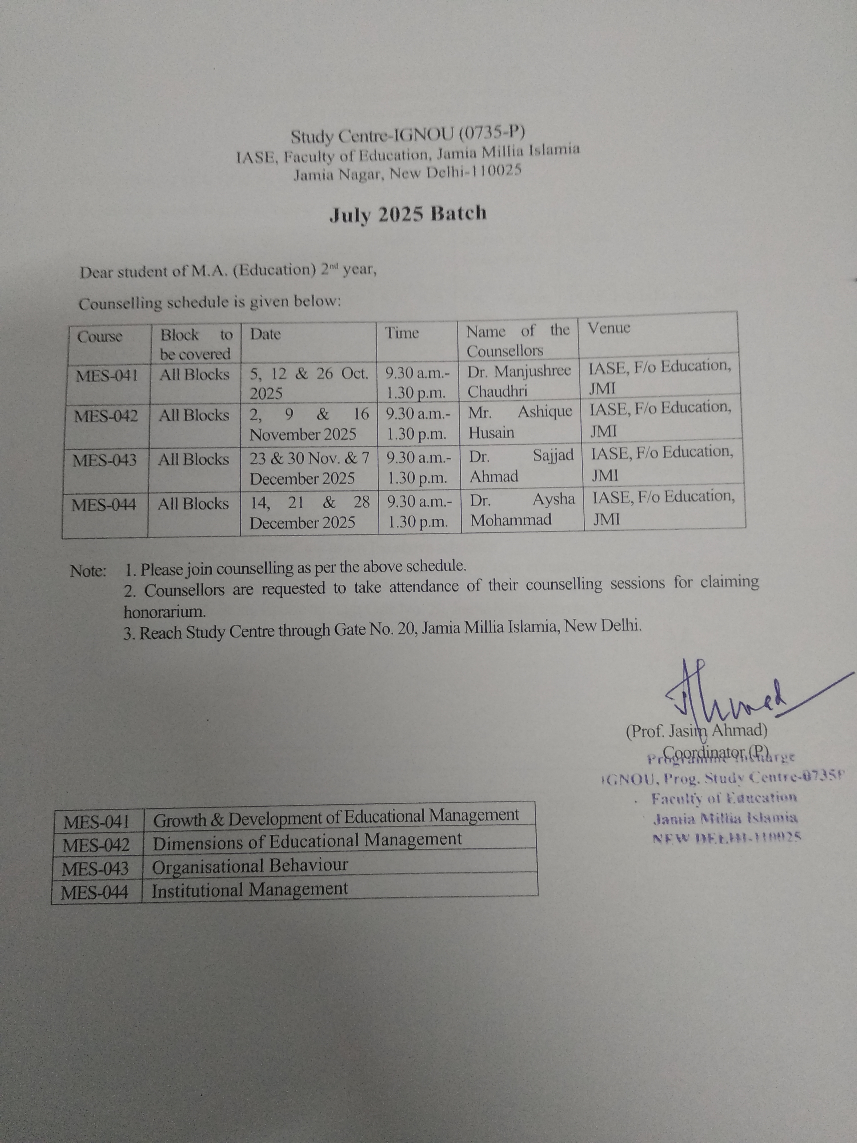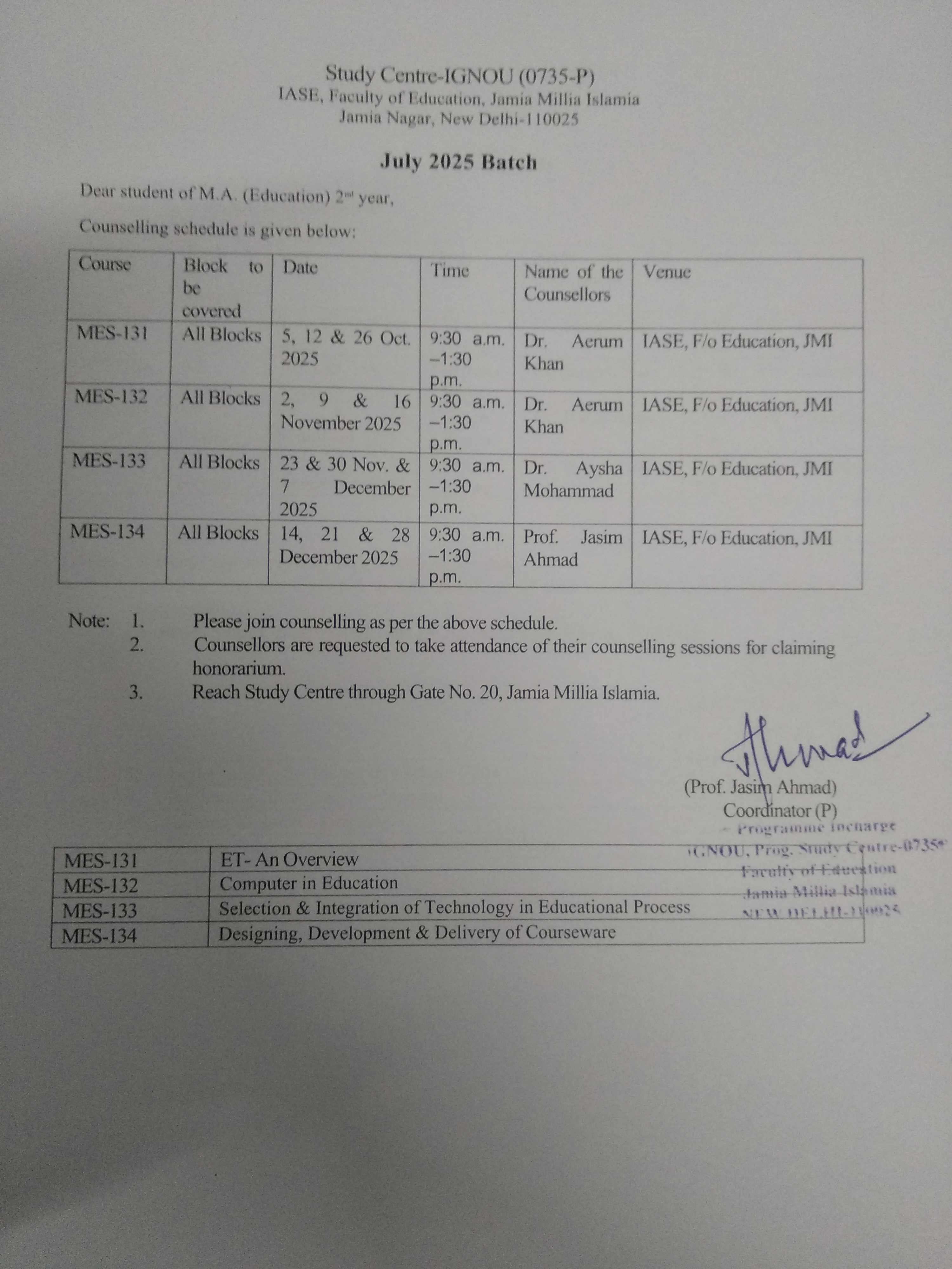 The Schedule of Online Academic Counselling Sessions of MGPS and PGDGPS the Nodal Regional center